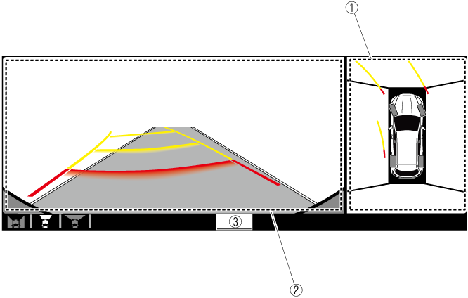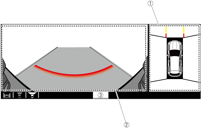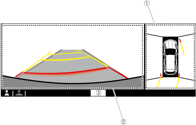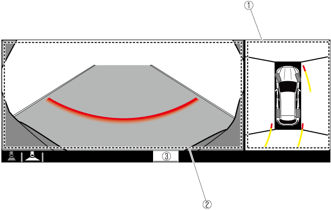 Affiche une image de la zone autour du véhicule et de l'arrière du véhicule (zone large).
