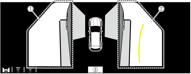 Affiche une image de la zone autour du véhicule et de l'avant du véhicule (zone large).