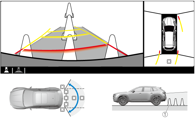 La portée de détection du capteur de stationnement est limitée. Par exemple, les obstructions se rapprochant sur le côté et les objets de faible hauteur peuvent ne pas être détectés. Toujours vérifier visuellement la sécurité du véhicule lors de la conduite.