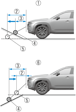 Il peut y avoir une certaine marge d'erreur entre la surface de la route apparaissant à l'écran et la surface réelle de la route. Une marge d'erreur de la distance perçue risque d'entraîner un accident; il faut donc être bien conscient des conditions suivantes qui sont plus susceptibles de produire des erreurs de perception de la distance.