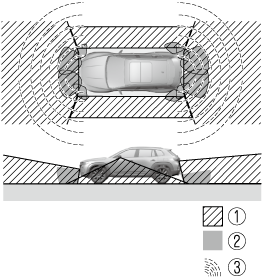 La portée des caméras et la capacité de détection des capteurs sont limitées. Par exemple, les zones en noir à l'avant et à l'arrière de l'image du véhicule et les zones où les images des caméras se rejoignent sont des angles morts pouvant cacher une obstruction. En outre, les lignes de largeur étendues et les lignes de trajectoire anticipée du véhicule doivent uniquement servir de référence, les images à l'écran peuvent différer des conditions réelles.