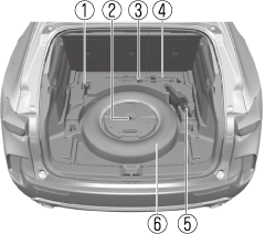 La roue de secours et les outils sont rangés aux endroits indiqués sur l'illustration.