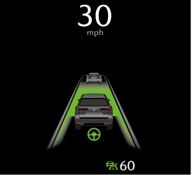Si un véhicule qui vous précède est détecté alors que vous roulez à une vitesse constante, le système passe au contrôle d'espacement. L'indication du véhicule qui précède est affichée à l'écran pendant le contrôle de l’espacement.