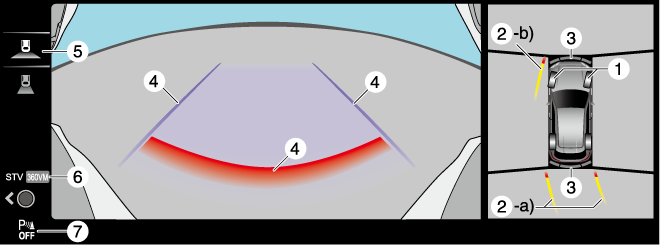La vue de dessus, la vue en transparence avant et la vue en transparence arrière sont affichées en traitant les images prises par chaque caméra. Par conséquent, les images peuvent être affichées comme suit.