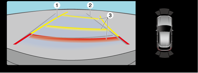Lignes de guidage de largeur du véhicule (jaunes) |