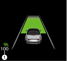 La conduite à vitesse constante commence lorsque la vitesse du véhicule est réglée. De plus, la vitesse de consigne est affichée à l'écran, et l'indication de veille MRCC (blanche) devient l'indication de réglage MRCC (verte) .