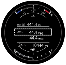 Ce mode affiche la consommation de carburant moyenne en calculant la distance totale parcourue et la quantité totale de carburant consommé depuis que le véhicule a été acheté ou que les données ont été réinitialisées. La moyenne de consommation de carburant est calculée puis affichée toutes les 30 secondes.