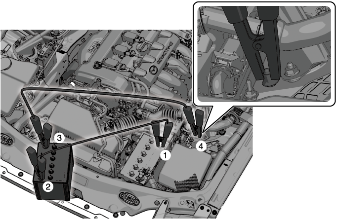 Le démarrage avec une batterie de secours est dangereux s'il n'est pas fait correctement. Par conséquent, suivre prudemment les instructions suivantes. Si vous n'êtes pas sûr de comment réaliser un démarrage avec une batterie de secours, adressez-vous à un mécanicien compétent.