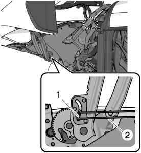 Le levier de verrouillage supérieur s'engage sur la carrosserie du véhicule (état verrouillé) à la position où les dents de l'engrenage (boîte à outils) sont en contact avec le support.