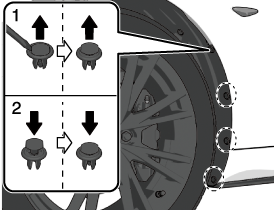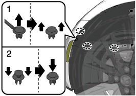Tirer le centre de chaque pièce de retenue en plastique et les retirer, puis retirer partiellement le garde-boue vers l'arrière.
