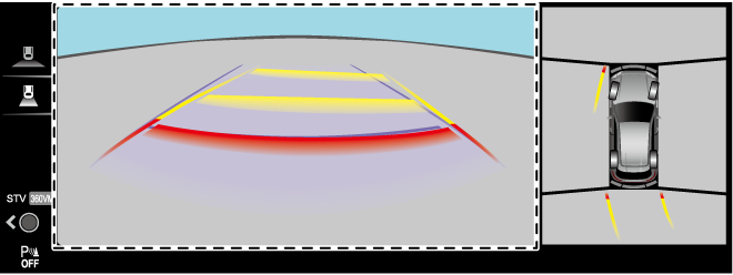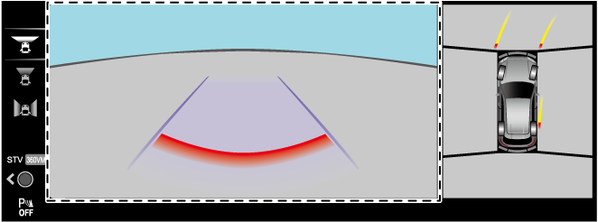 Affiche une image de caméra de l'arrière du véhicule comme s'il était transparent ainsi que les lignes de guidage pour aider à vérifier la zone à l'arrière/les côtés du véhicule lors de la marche arrière, du stationnement ou de l'arrêt.