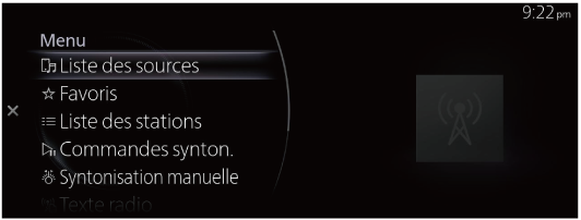 Si vous sélectionnez l'icône, la prochaine station disponible est automatiquement syntonisée. Les stations recevables sont syntonisées dans l'ordre croissant toutes les 5 secondes. Une fois qu'une station souhaitée a été trouvée, sélectionner à nouveau l'icône pour désactiver la fonction. |