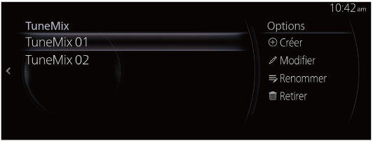 Affiche la liste TuneMix actuellement créée. Sélectionner le canal TuneMix pour commencer la lecture. De plus, un canal TuneMix peut être créé ou supprimé. Pour plus de détails, se référer à TuneMix™. |