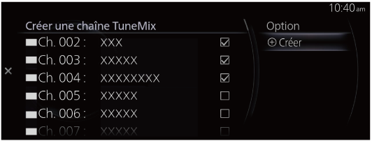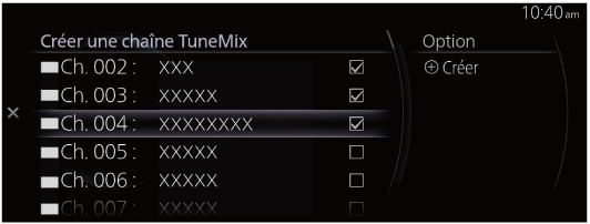 Sélectionner plusieurs stations de radio que vous voulez enregistrer dans le canal TuneMix™ dans la liste des canaux musicaux SiriusXM®. Une coche est placée à côté de la station sélectionnée.