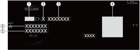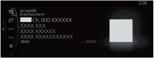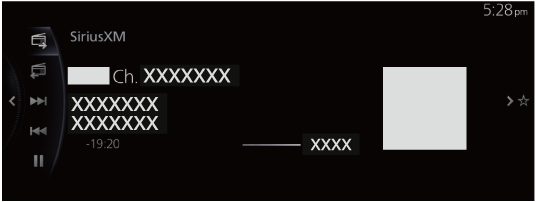Affiche la liste des Favoris pour SiriusXM®. La liste des stations de radio enregistrées dans vos Favoris s'affiche et vous permet de sélectionner la station de radio que vous souhaitez écouter. Si vous n'avez pas de Favoris enregistrés, une liste vide s'affiche. Se référer à Favoris (Rechercher) pour la méthode d'enregistrement des Favoris. |