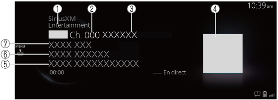 Permet de régler SiriusXM®. Pour les éléments que vous pouvez régler, se référer à Paramètres SiriusXM. |
