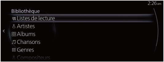 Affiche l'écran Bibliothèque. Vous pouvez sélectionner la catégorie que vous voulez jouer comme album ou artiste. Pour plus de détails, se référer à Sélectionner des pistes dans la Bibliothèque. |