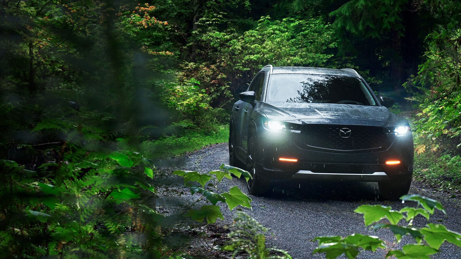 Une Mazda gris foncé roule sur une route sinueuse bordée d’arbres.