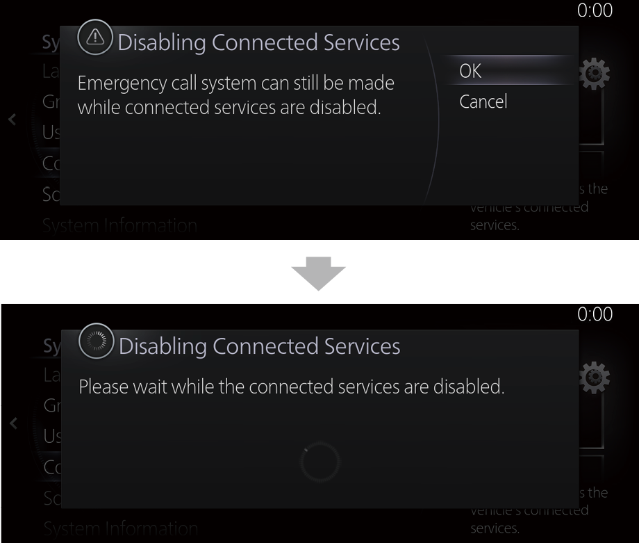 This mode disables the onboard communication unit temporarily to stop the vehicle’s data communication. Additionally, the disabled onboard communication unit can be enabled. Mazda Connect is used for making the setting.
