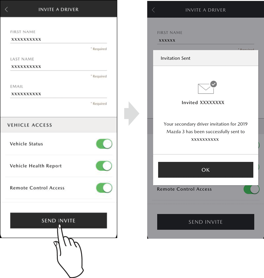 After entering the Secondary Driver information and setting the permission to be given, touch SEND INVITE and follow the instructions on the screen.