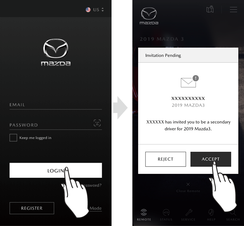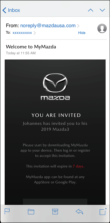 Invitation email will arrive at the email address sent by the primary driver. Install the MyMazda APP and log in following the instructions.