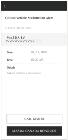 If the vehicle cannot be driven due to a certain malfunction, the device receives information about the malfunction and a notice will be displayed without having to launch the MyMazda APP. Touching the notice on the display shows the details of the malfunction.