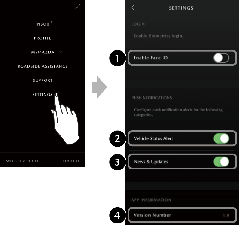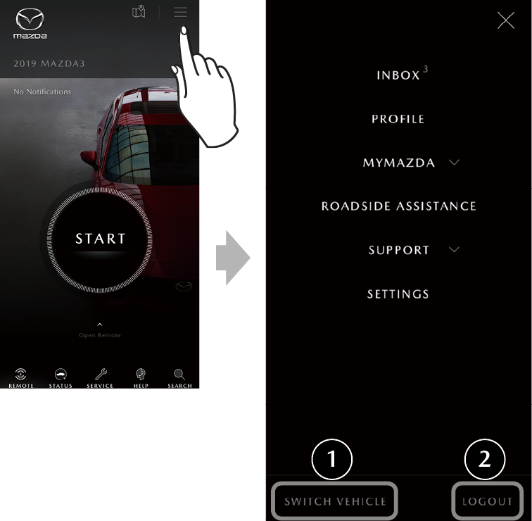1 Vehicle Tab If you have registered two or more vehicles, the target vehicles for the MyMazda APP can be switched.