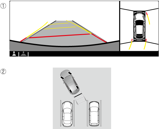 • The following shows an example of vehicle parking with the steering wheel turned to the left while backing up the vehicle. When backing into a parking space from the opposite direction, the steering operation is reversed.