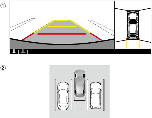 • Ce qui suit est un exemple de véhicule en cours de stationnement où le volant est tourné vers la gauche lors de la marche arrière du véhicule. En reculant dans un espace de stationnement en sens inverse, la direction est inversée.